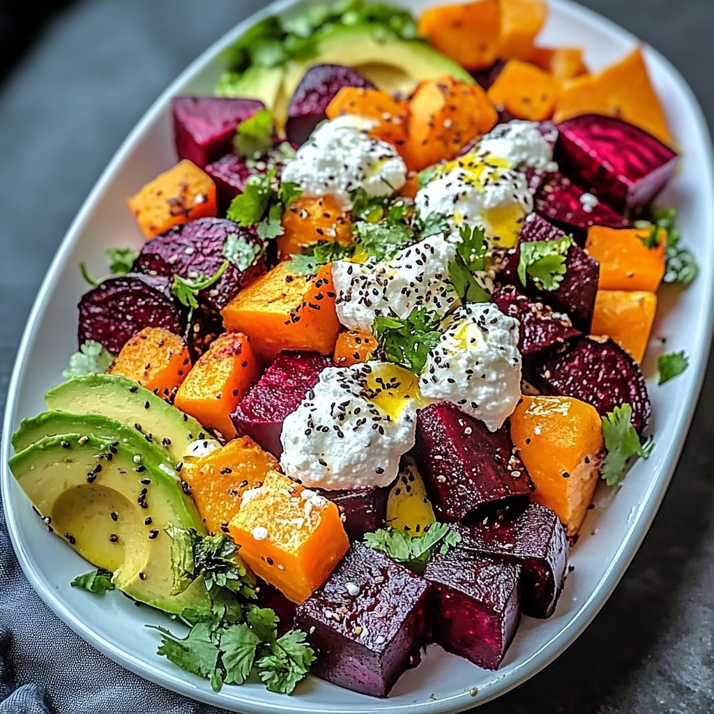 Indulge in the vibrant flavors and textures of the Roasted Beet, Sweet Potato & Avocado Salad with Whipped Ricotta & Lemon-Tahini Drizzle. This colorful dish combines earthy roasted beets, caramelized sweet potatoes, and creamy avocado, all elegantly finished with a smooth whipped ricotta and zesty lemon-tahini drizzle. Perfect for lunch, dinner, or as a stunning side at gatherings, this salad is not only visually appealing but also packed with nutrients. Enjoy it warm or cold, making it a versatile addition to your meal repertoire.